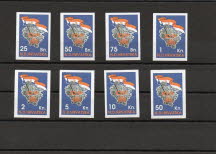Limited to 500 non-perforated sets with 8 stamps of 25 Banica, 50 Banica, 75 Banica, 1 Kuna, 2 Kuna, 5 Kuna, 10 Kuna and 50 Kuna.