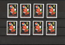Limited to 500 non-perforated sets with 8 stamps of 1 Kuna, 2 Kuna, 3 Kuna, 4 Kuna, 5 Kuna, 6 Kuna, 7 Kuna and 8 Kuna.