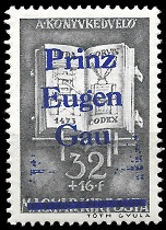 For the planned proclamation of "Prinz Eugen Gau" on Hilter's birthday on April 20, 1941, the German ethnic group issued a special overprint of "Prinz Eugen Gau" on three of the five Hungarian postage stamps issued on the occasion of the 500th birthday of Hungarian King Matthias Hunyadi Korvid.